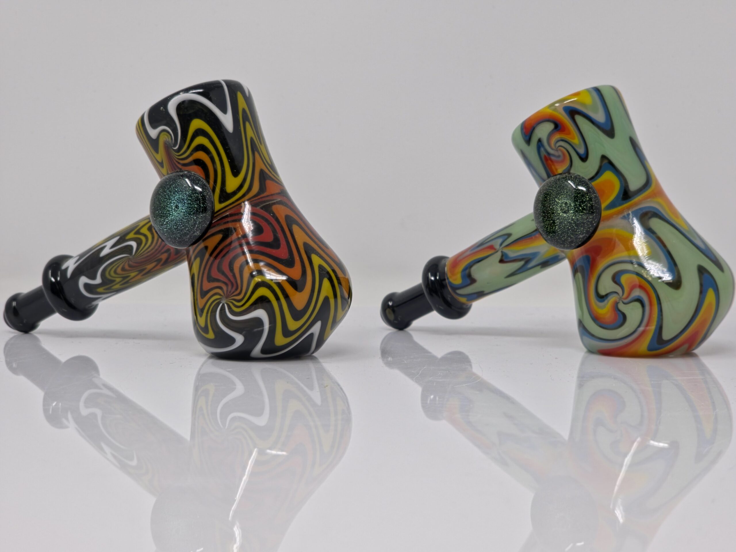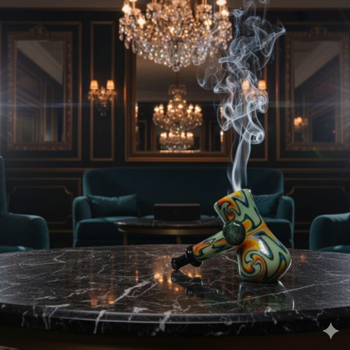 Ditch the standard glass for something with real soul. The BB22 series combines a sophisticated hammer-style silhouette with mind-bending “reverse” swirl patterns that look like they’ve been pulled straight from a high-end gallery. Set against a backdrop of velvet chairs and marble tables, these pieces glow with a cool, hip energy that commands attention the moment the first cloud hits the air.