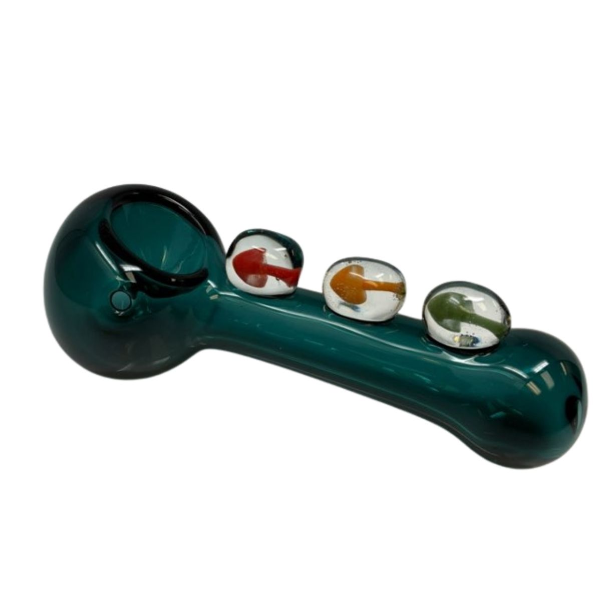 The “Shroom” Trio: Three crystal-clear glass marbles are fused along the stem, each encapsulating a miniature, hand-crafted mushroom in iconic Rasta hues—red, orange, and green. 🍄✨