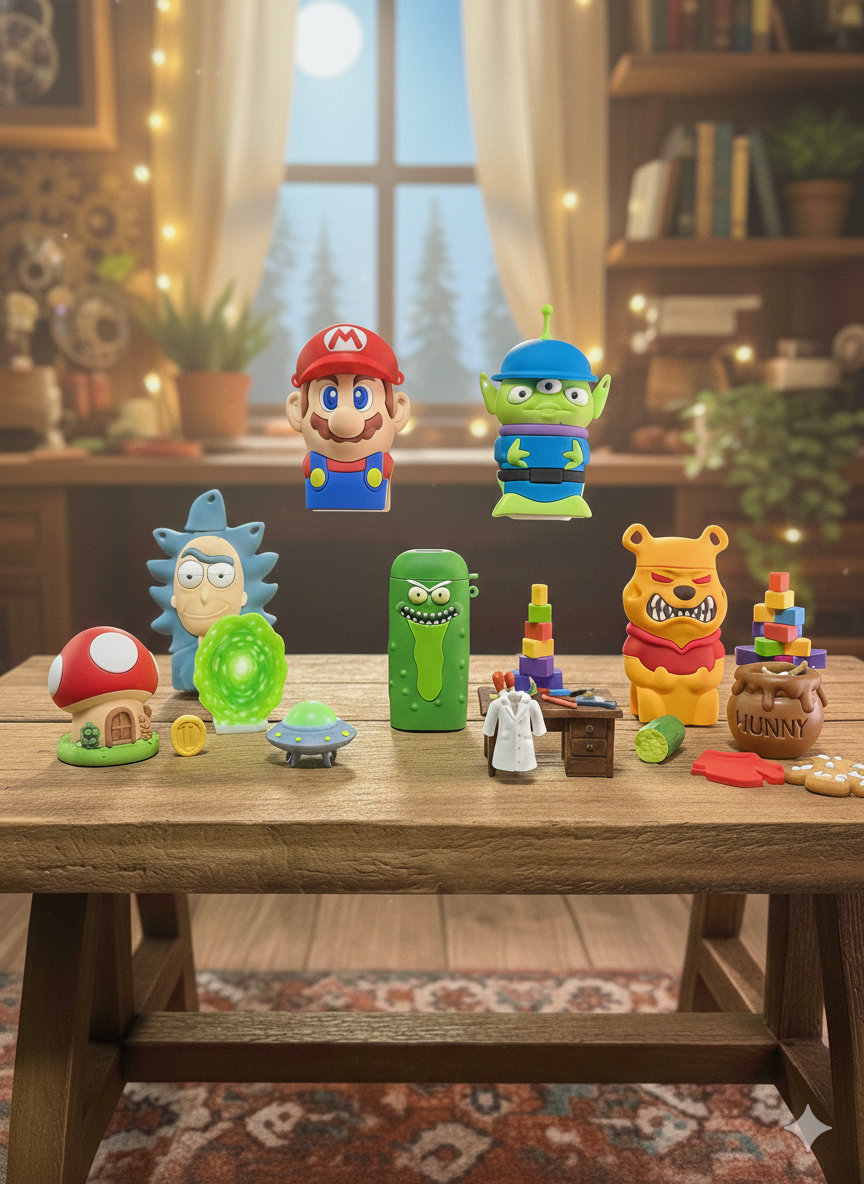 Iconic Character Designs: Features a wide variety of 3D-molded characters, including Mario, Rick Sanchez, Pickle Rick, the Toy Story Alien, and a fierce Pooh Bear.