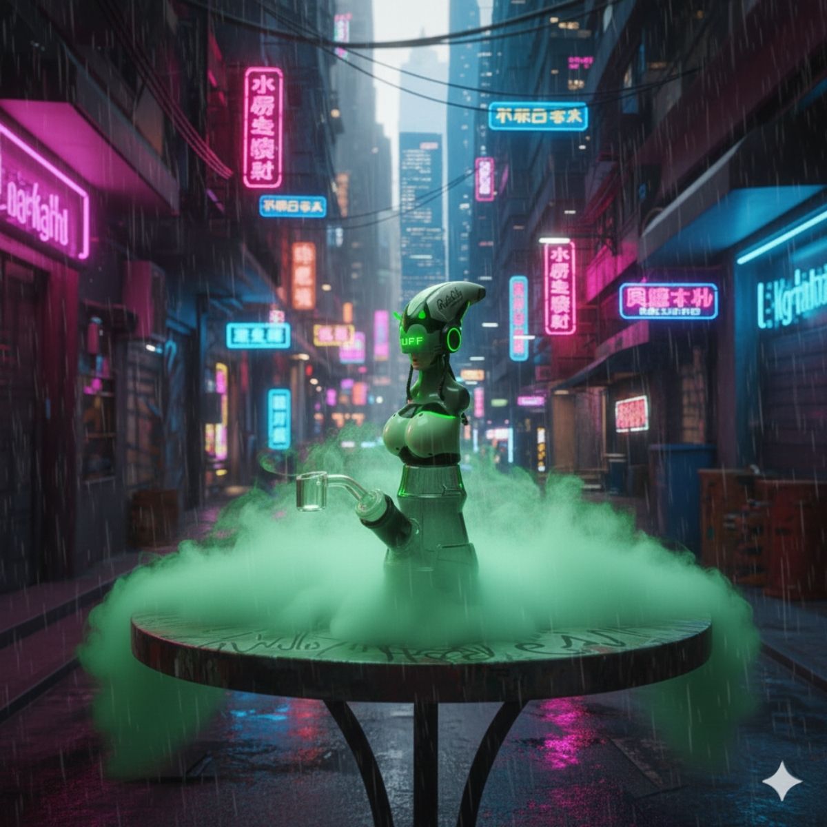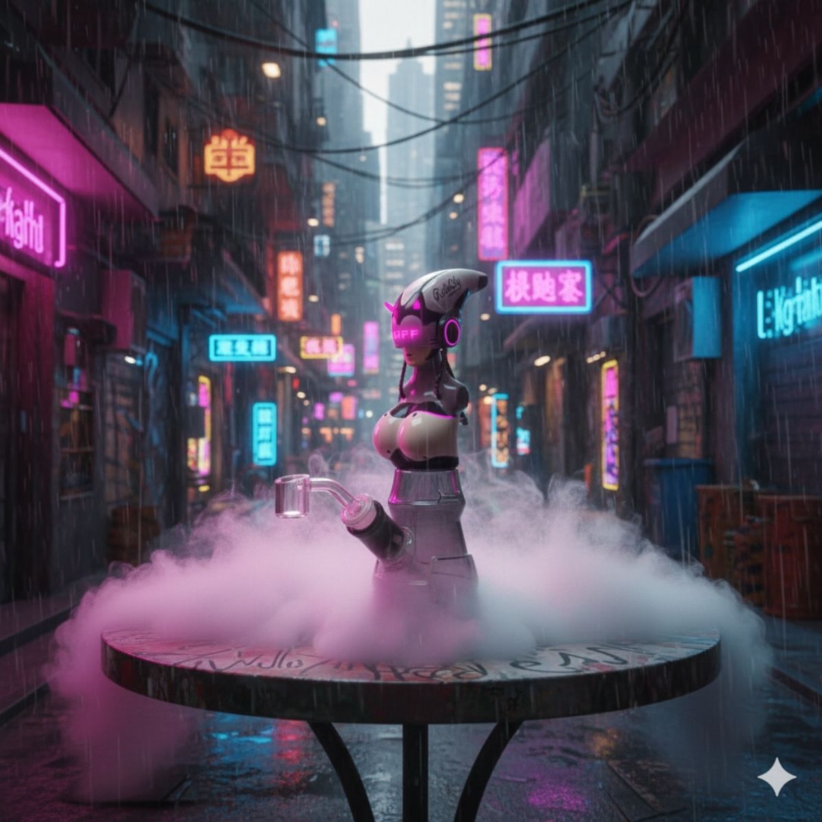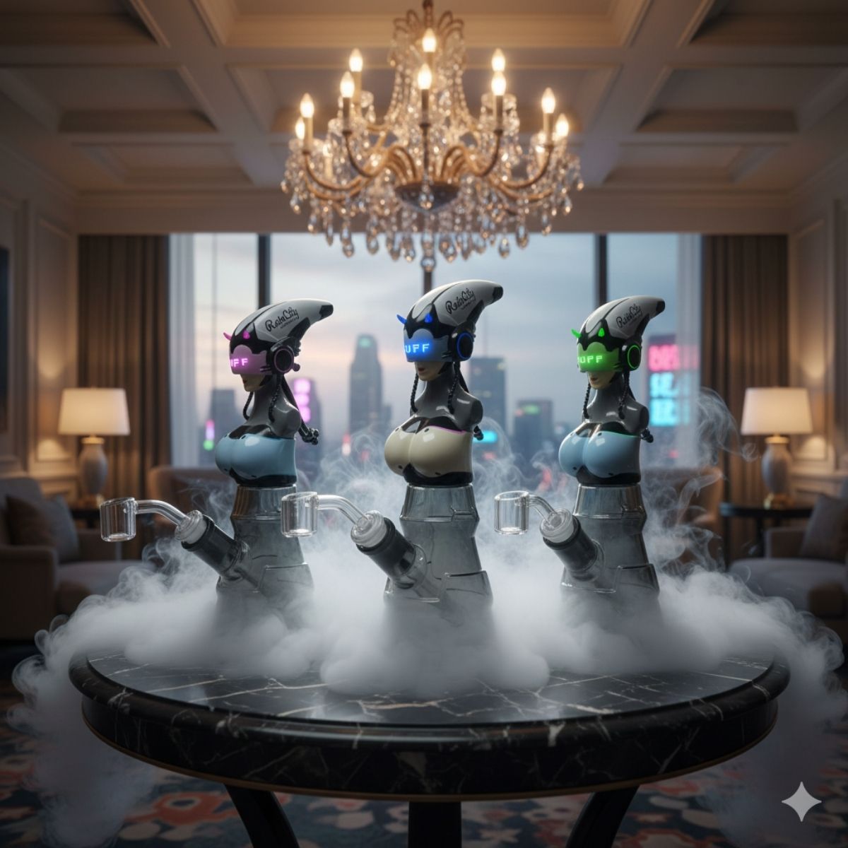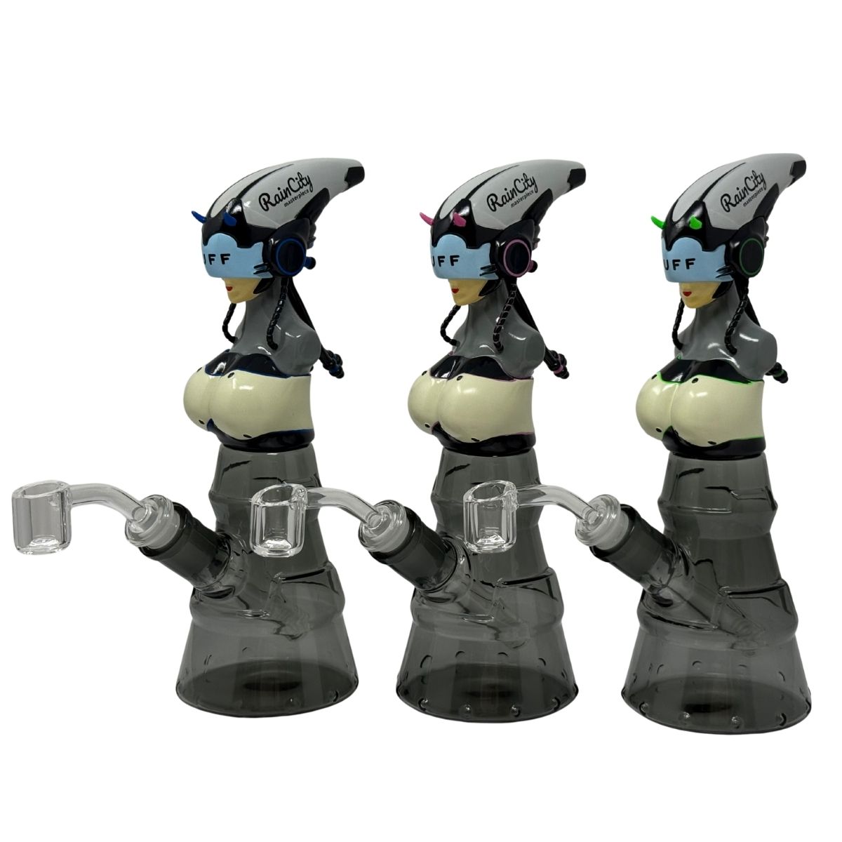 Welcome to the big leagues with the RC045 C-PUNK GIFT SET. This hybrid rig fuses a sleek, smoked-glass beaker base with a detailed, cyber-inspired android bust. Available in Neon Pink, Electric Blue, and Acid Green, it features glowing visors and integrated tech details that look like they were ripped straight from a Night City penthouse.