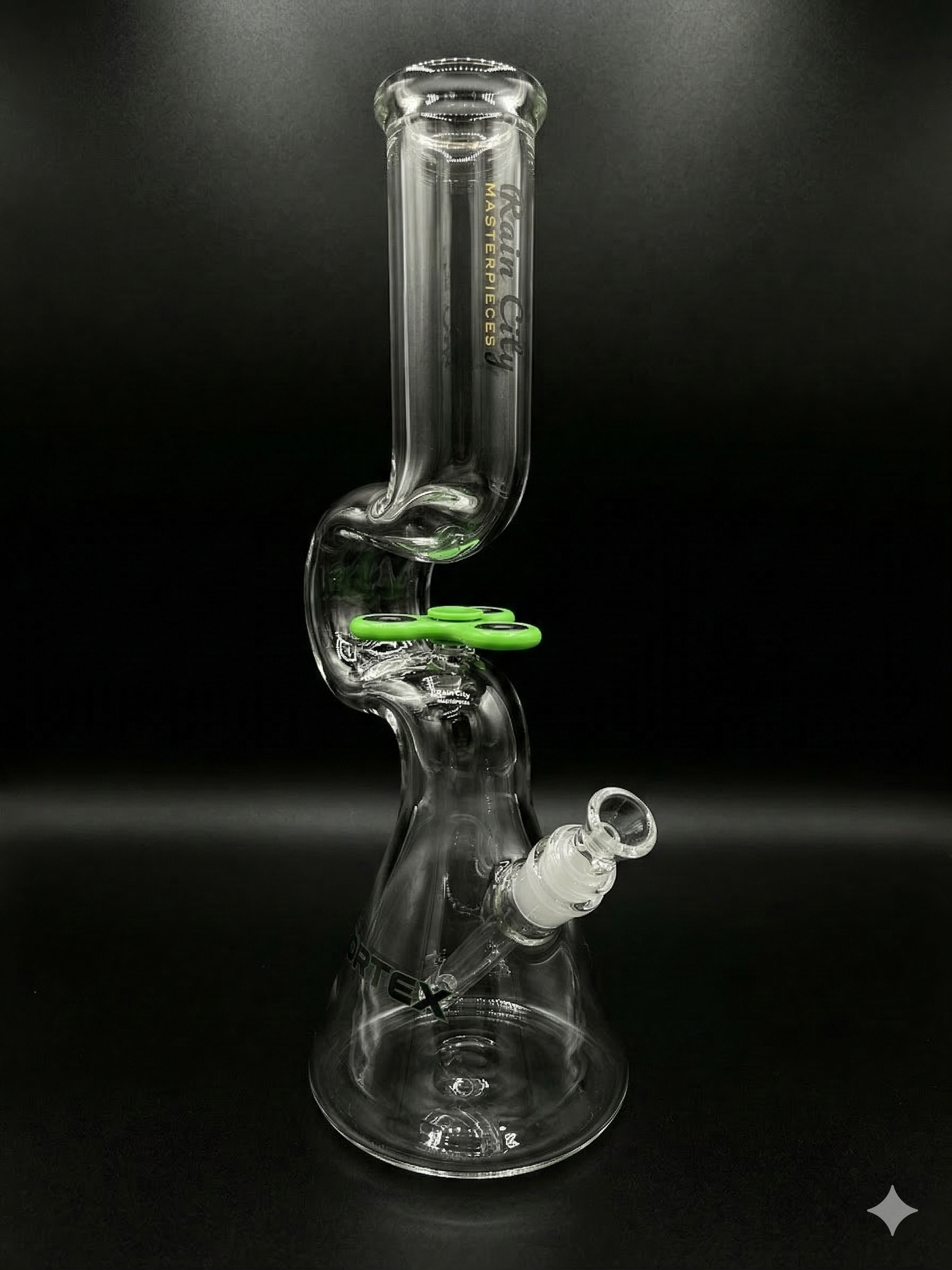 The centerpiece of this rig is its unique curved neck, which serves as a natural splash guard, ensuring a dry and comfortable experience even during heavy use. The wide beaker base provides a low center of gravity for maximum stability, while the signature lime green floral accent adds a pop of modern color to the crystal-clear borosilicate frame.