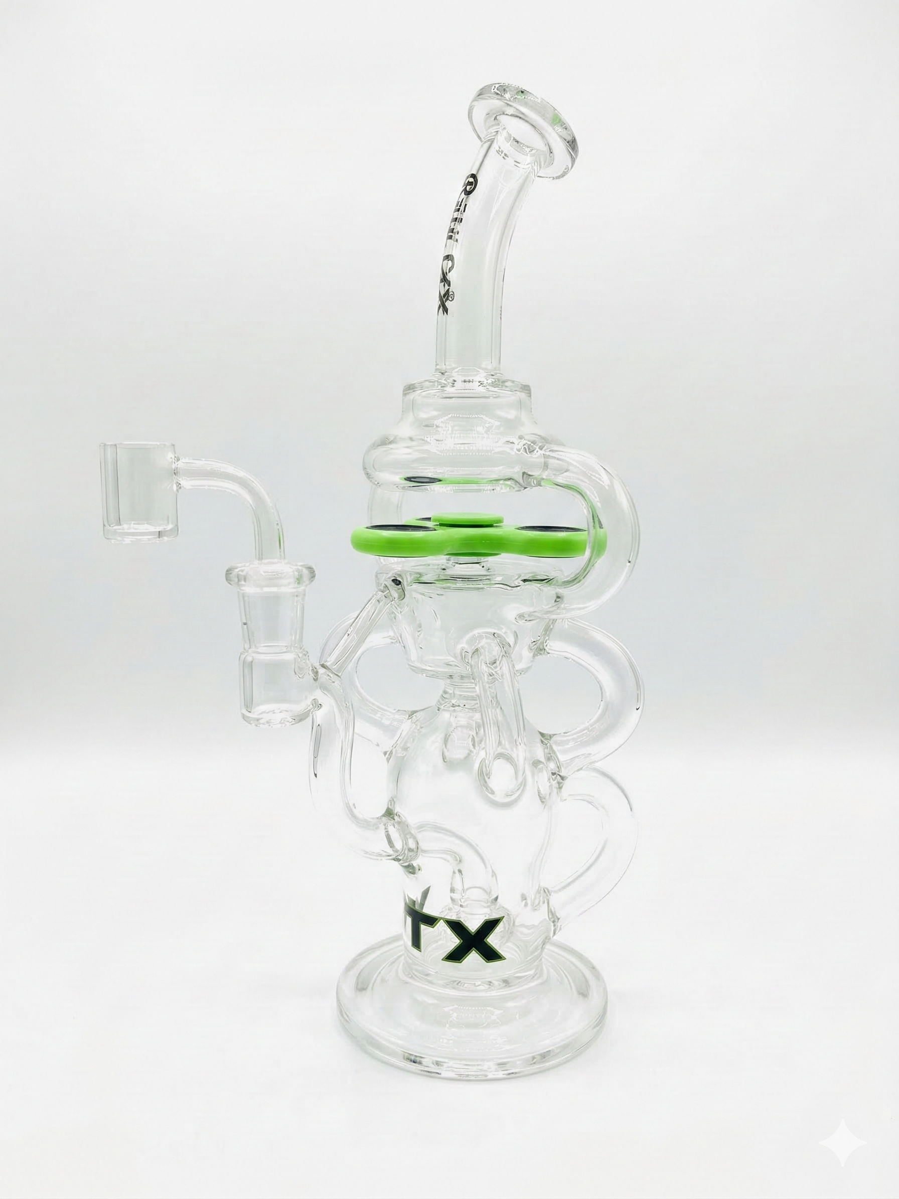 RC079 VTX OCTO CYCLE is defined by its intricate network of external recycler arms. This quad-path system creates a powerful, continuous loop of water and vapor, ensuring that every draw is double-cooled and filtered before it reaches the mouthpiece. The result is a silky-smooth, temperature-controlled hit that highlights the pure flavor of your material. The signature lime green “gear” splash guard sits at the center, serving as both a functional barrier and a bold mark of Minimalist Luxury.