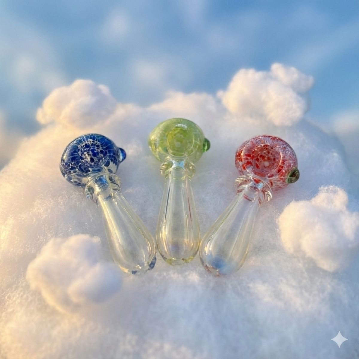 Each pipe features a sleek, crystal-clear glass stem that lets you see the smoke travel, leading down to a dope, colorful bowl. The bowls are packed with crushed glass frit, giving them a crazy textured look and intense bursts of color—choose from deep blue, vivid green, or bright red.
