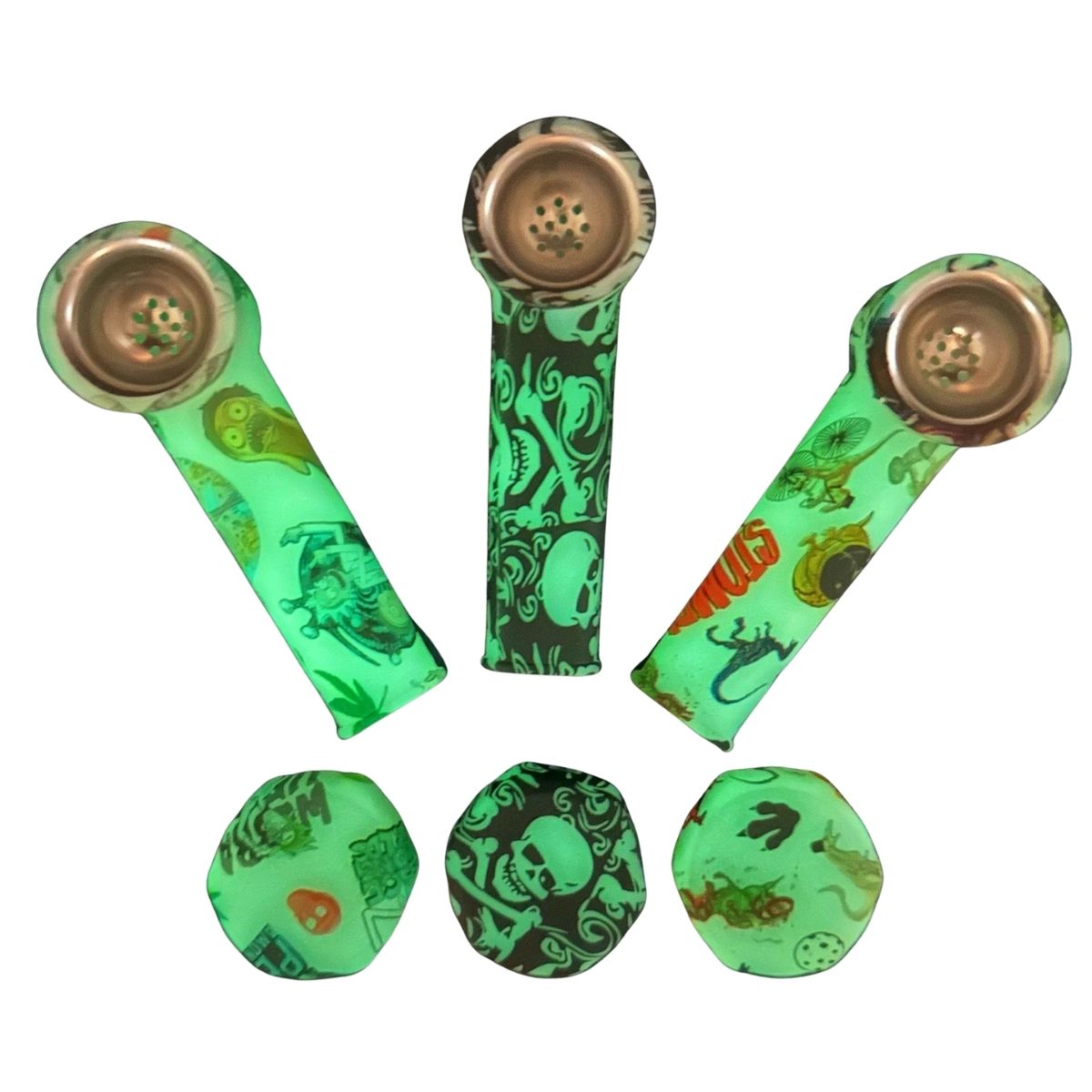 Radioactive Vibes Crafted from high-quality phosphorescent silicone, this pipe absorbs light and emits a bright, neon green glow in the dark. It features sick, high-contrast graphic prints to match your energy: