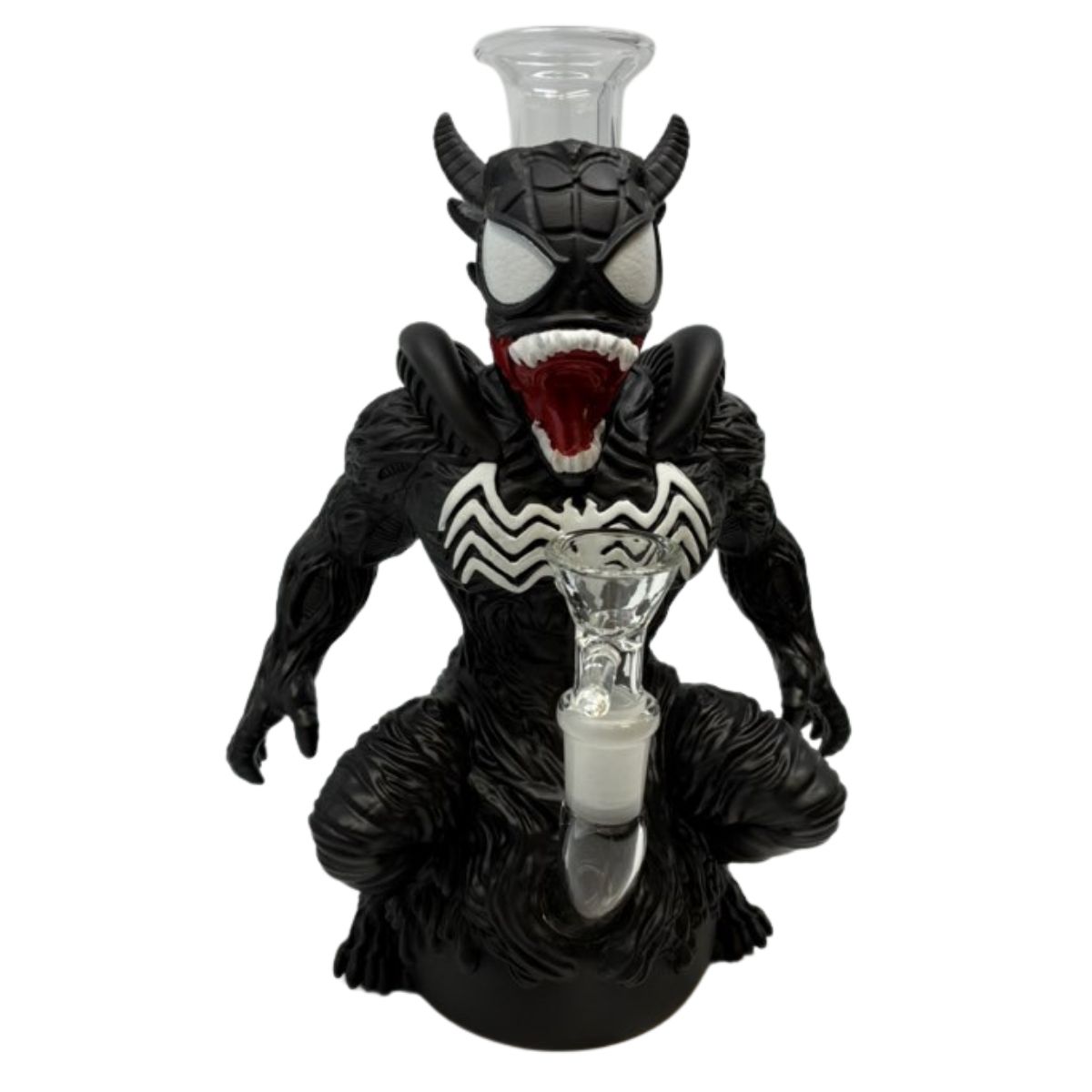 Design & Craftsmanship: Inspired by the iconic “alien symbiote” look, this piece features a matte black, textured finish that mimics organic armor. The striking white spider emblem and fierce, wide-eyed mask create an imposing presence on any shelf. But it’s not all about looks—the central glass core is engineered for maximum durability and heat resistance. 🧪✨