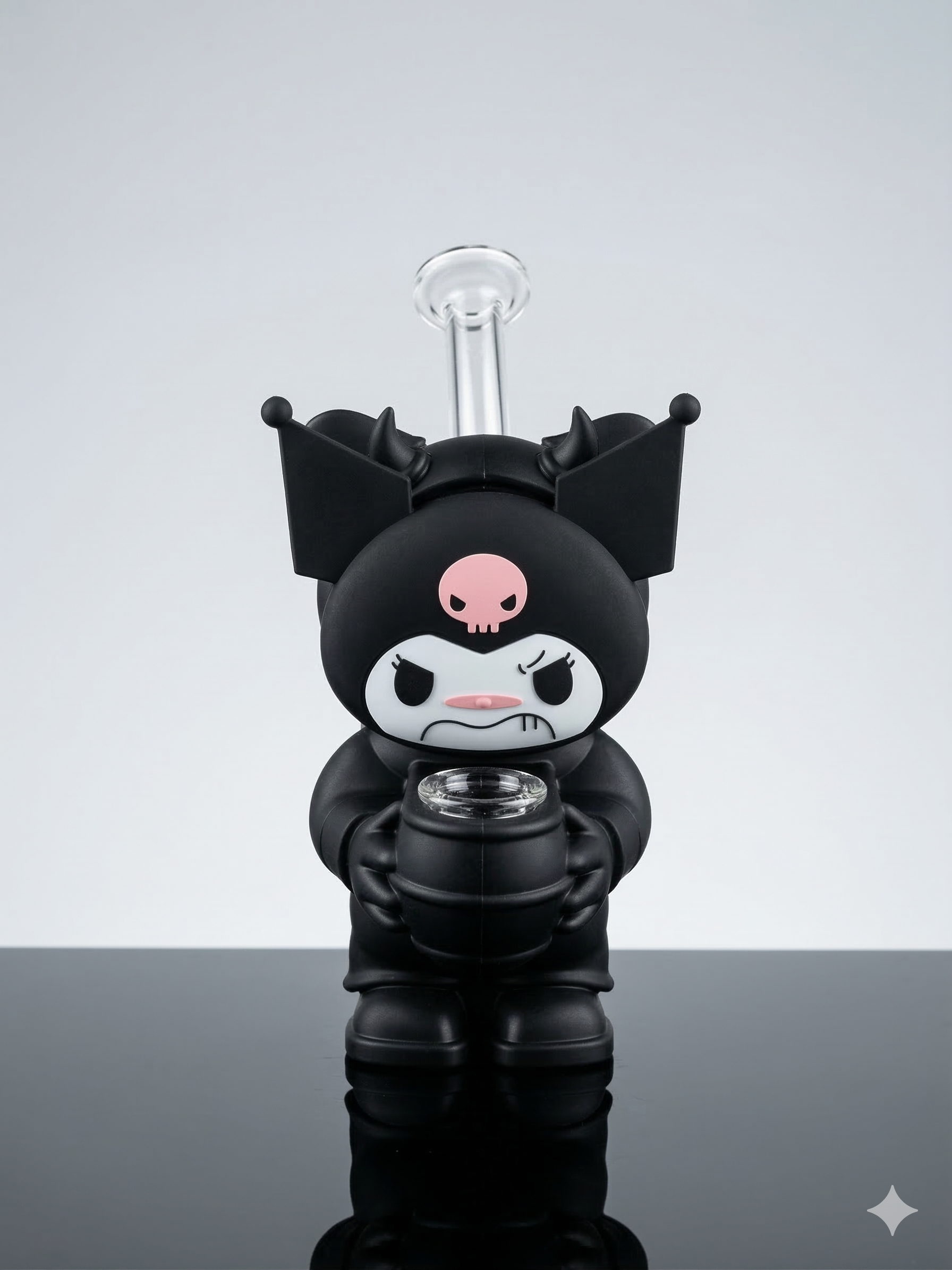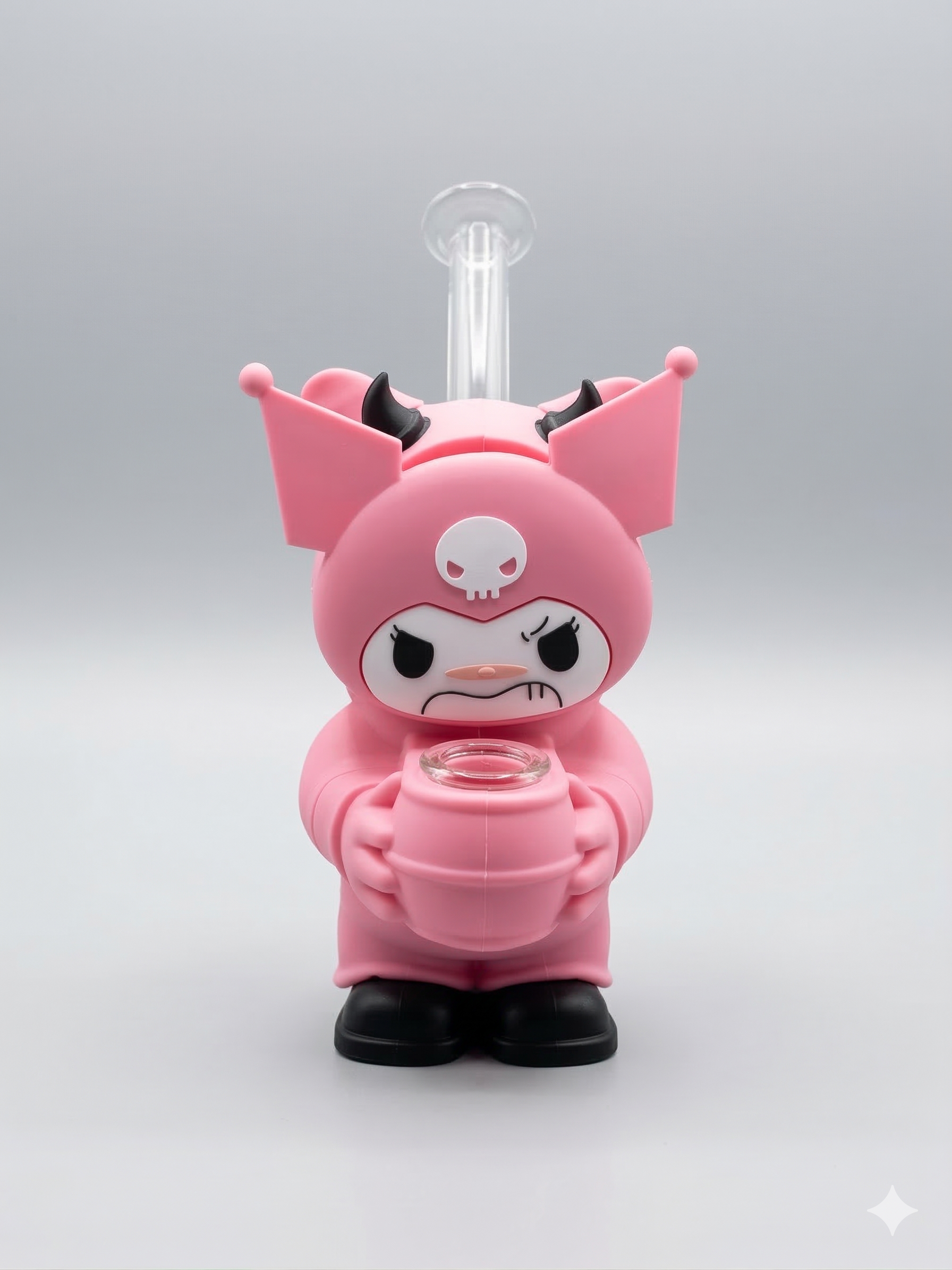 • Ergonomic Mouthpiece: A prominent, curved glass tube extends from the back of the character’s head, serving as the mouthpiece for consumption.
