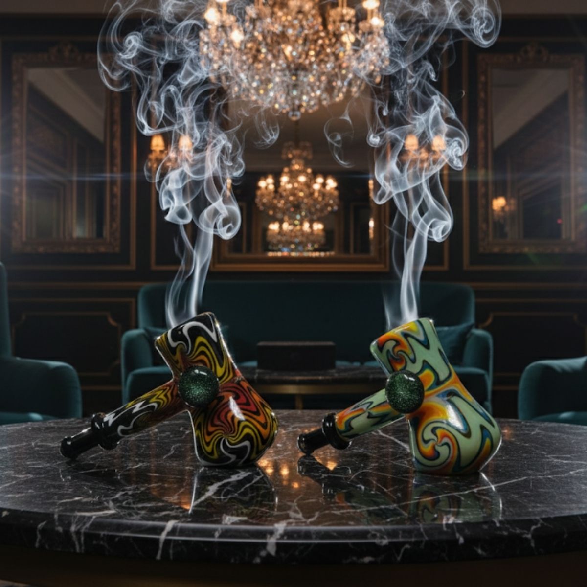 Ditch the standard glass for something with real soul. The BB22 series combines a sophisticated hammer-style silhouette with mind-bending “reverse” swirl patterns that look like they’ve been pulled straight from a high-end gallery. Set against a backdrop of velvet chairs and marble tables, these pieces glow with a cool, hip energy that commands attention the moment the first cloud hits the air.